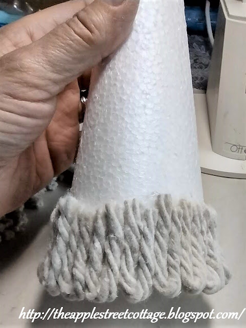 In the interest of full disclosure, I started putting the hot glue on the cone and discovered it melted the styrofoam.  Of course it did - Silly me!  Then I put the glue on the ends of the loops first, pressed them on the cone, and had much more success.