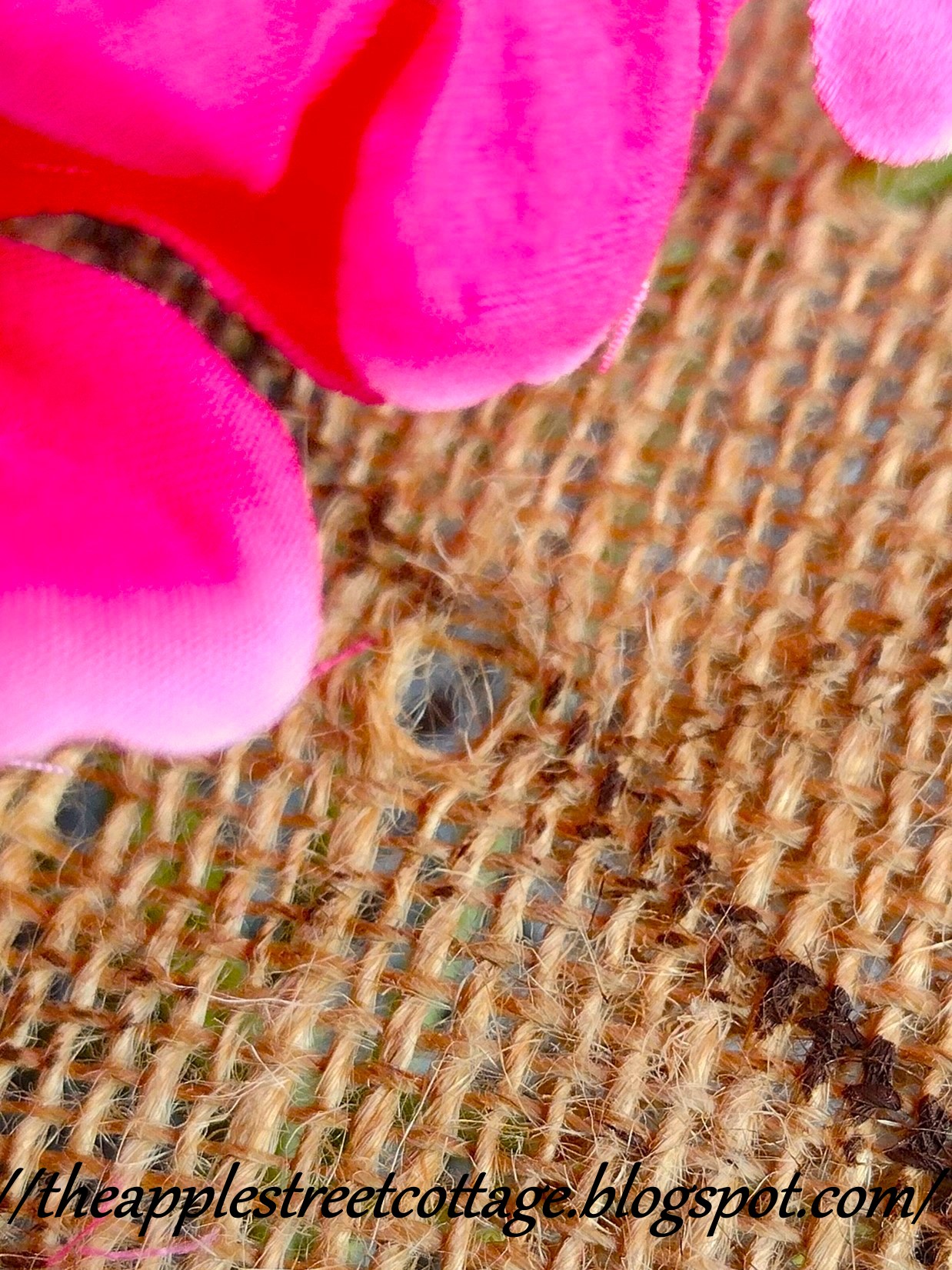 This is where the 'learning curve' comes in. I decided to push the stems through the burlap to make holes. The problem was the mess I ended up with on the back.